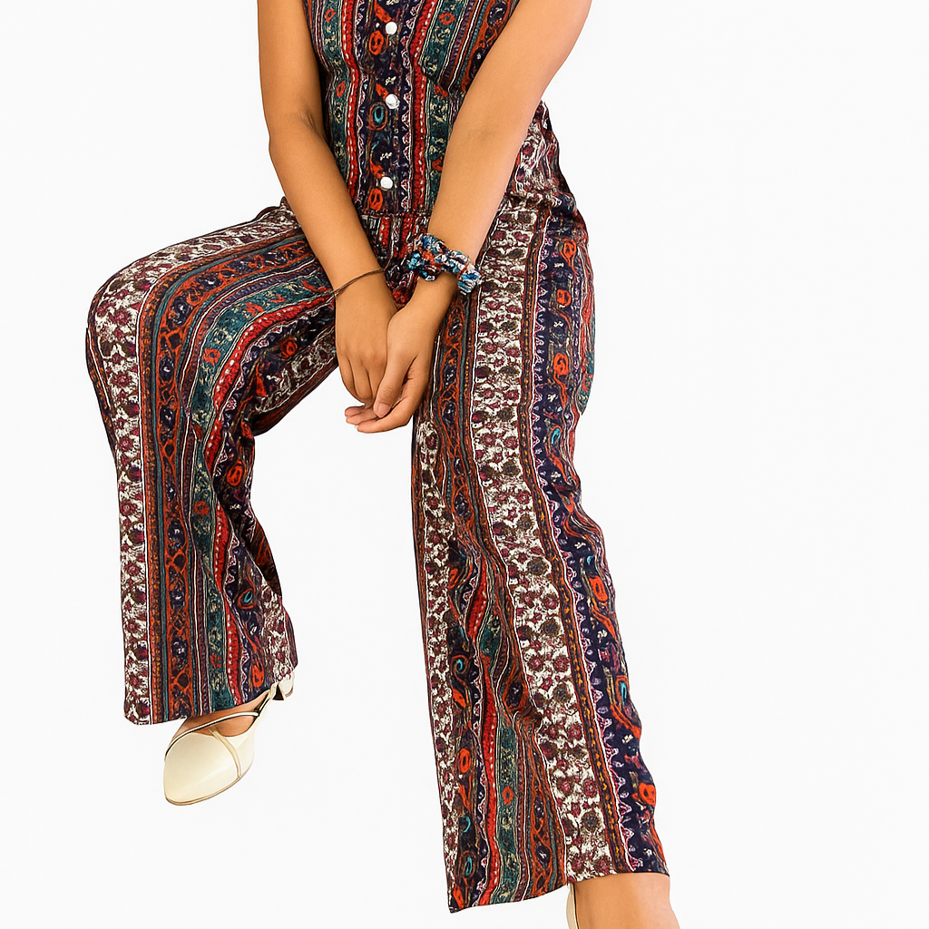 This 2-piece women’s arranged set includes a breezy sleeveless top with a Korean collar and comfortable plazo-style bottoms, all in a stunning traditional inspired print. Made with premium FABRICS the fabric feels light and breathable — perfect for everyday wear or a chic day out.